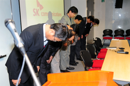 | ▲ SK커뮤니케이션즈가 운영하는 네이트와 싸이월드가 중국발 해킹을 당해 3500만 명의 고객정보가 유출된 사태와 관련해 임직원들이 지난해 7월 29일 SK커뮤니케이션즈 본사에서 열린 기자회견에 사과하고 있다. ⓒ뉴시스 |