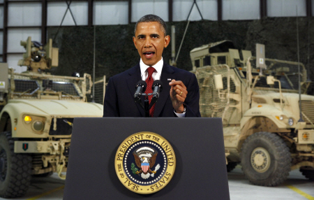 <뉴욕타임스>에 따르면 아프간 수도 카불에 현지시각으로 오후 10시 경 도착한 오바마 대통령은 하미드 카르자이 아프간 대통령을 만나 현지시각으로 새벽 1시30분 경 양국간 전략적 동맹에 관한 협약을 체결한 뒤 아프간 바그람 미 공군기지에서 미국 국민을 상대로 미국에 TV로 생중계된 특별 연설을 했다. 미국 시간으로는 1일 오후 7시30분이고, 아프간 현지에서는 아침 일과가 시작되기 전이었다.