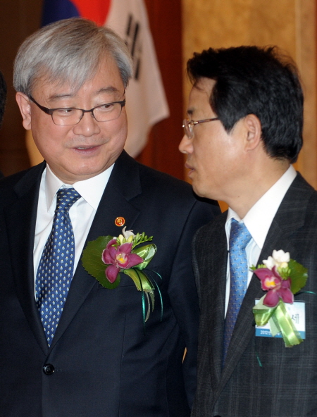 | ▲ 마그네틱 카드를 IC카드로 전환하는 정책이 전형적인 탁상행정으로 드러났지만, 잇딴 연기 조치로 시민들을 골탕 먹이고 있다. 사진은 이 정책의 주무부처의 수장인 김석동 금융위원장과 권혁세 금감원장.. ⓒ뉴시스 |