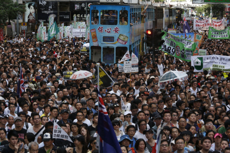 홍콩 시내 곳곳에서는 주민들이 몇 만명씩 모여 민주주의 보장 등을 외치며 가두행진을 벌였다. <AFP>는 "이번 시위에는 엔지니어와 공무원, 주부와 학생, 파룬궁 회원과 노조뿐 아니라 일반 시민이 남녀노소 가릴 것 없이 참가했다"고 전했다.