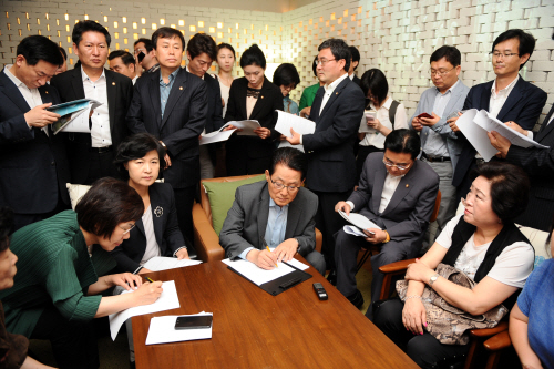 | ▲박지원 원내대표를 비롯한 민주당 의원들이 3일 <두 개의 문>을 단체 관람하기 직전 유족·구속자 가족들과 간담회를 갖고 구속 철거민 석방 탄원서에 서명하고 있다. ⓒ뉴시스 |