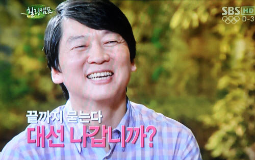 안 원장은 23일 SBS TV의 예능 프로그램인 <힐링캠프>에 출연, 대선 출마 결심과 관련해 "3가지 정도 생각해야 할 것이 있다"면서 "첫째, 과연 나를 지지하시는 분들의 생각이 무엇인가, 둘째, 제 생각이 그 분들의 기대 수준에 맞을 수 있나, 셋째, 제가 능력과 자격이 있는가"라고 말했다.