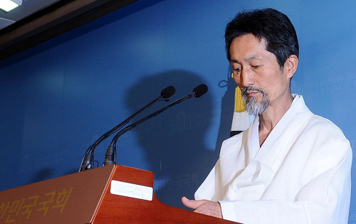 | ▲강기갑 통합진보당 대표가 27일 국회 기자회견장에서 대국민 사과문을 발표하고 있다. ⓒ뉴시스 |