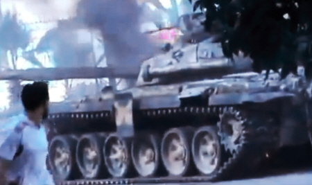 | ▲ 시리아 최대도시 알레포에서 정부군이 무장헬기와 탱크를 앞세워 반군을 공격하고 있다. 사진은 알레포의 교전 현장에서 촬영된 영상 중 반군에 의해 파괴된 탱크의 모습. |