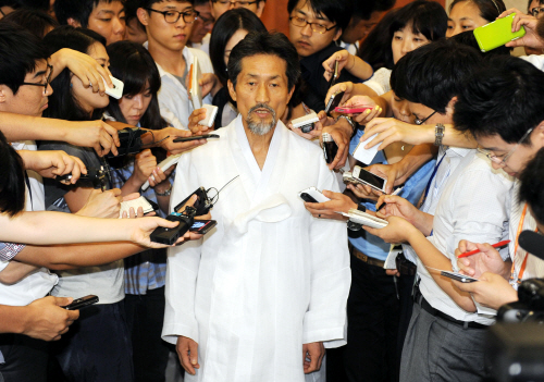 | ▲6일 국회 기자회견을 마친 강기갑 통합진보당 대표가 취재진의 질문에 답하고 있다. ⓒ뉴시스 |