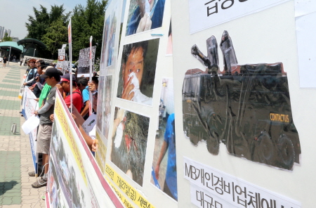 | ▲ 미국의 민간군사업체 블랙워터가 저지른 각종 불법행위에 대해 미국 정부가 솜방망이 처벌을 거듭하고 있다. 국내에서도 컨택터스라는 용역경비업체가 민간군사기업을 방불케하는 장비를 보유하고, 노동자들을 무차별 폭행한 사건이 정치적 쟁점이 되고 있다. 사진은 8일 국회 앞에서 컨택터스의 만행을 규탄하는 집회 모습. 오른쪽에는 피해자들과 컨택터스가 보유한 시위 대응 특수차량 등이 전시돼 있다. ⓒ연합뉴스 |