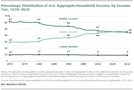 부의 양극화를 보여주는 이 현상은 전체소득에서 중산층이 차지하는 비율을 보면 더 극적인 변화가 감지된다. 1970년대에는 전체소득에서 중산층 소득이 차지하는 비율이 62%에 달하고 고소득층은 29%에 그쳤다. 하지만 2010년에는 중산층이 전체 소득에서 차지하는 비중은 45%로 급감하고, 고소득층이 전체 소득에서 차지하는 비중이 46%로 중산층 소득 비중보다 많아졌다.