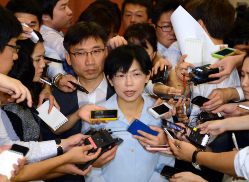 | ▲이정희 전 통합진보당 공동대표가 3일 기자회견 후 기자들의 질문에 답하고 있다. 이 전 대표 왼쪽 뒤로 이상규 의원(서울 관악을, 초선)의 모습이 보인다. ⓒ뉴시스 |