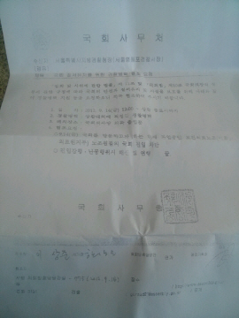 배성례 국회 대변인은 <프레시안>과의 통화에서 "사실이다. (견학신청이 불허돼 두 의원이) 항의하신 상황은 맞다"면서도 "담당 부서에서 왜 그런 결정을 내렸는지는 모르겠다"며 대변인실은 상황을 파악하지 못하고 있다고 밝혔다. 담당 부서 관계자는 "국회 내 시위 가능성이 농후하다"며 "취지는 좋으나 노조가 통일된 복장으로 핸드마이크 등을 가지고 들어오기 때문"이라고 말했다.