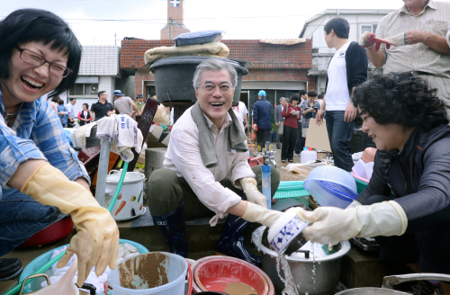 | ▲문재인 민주당 대선후보가 18일 태풍피해 현장을 찾아 주민들과 진흙이 묻은 가재도구를 씻어내고 있다. ⓒ뉴시스 |