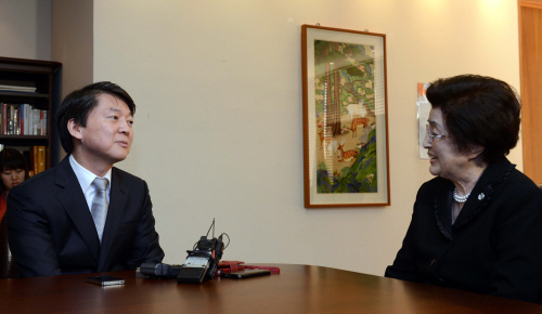| ▲무소속 안철수 대선후보가 2일 서울 마포구 김대중도서관을 방문해 이희호 김대중평화센터 이사장과 환담하고 있다. ⓒ뉴시스 |