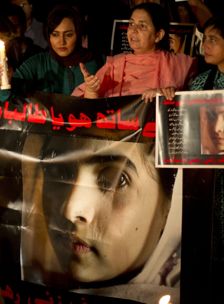 | ▲ 파키스탄 남부 카라치에서 주민들이 유사프자이의 사진을 내걸고, 탈레반 규탄 시위를 벌이고 있다. ⓒAP=연합 |