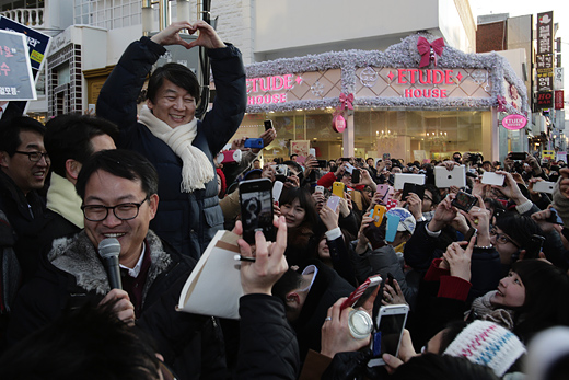 | ▲11일 서울 홍대앞 거리에서 지원유세 중인 안철수 전 무소속 후보가 손으로 하트 모양을 그리고 있다. 그를 향한 20대 청년층의 반응은 뜨거웠다. 8일 후, 이들의 선택에 따라 대선 결과과 좌우될 수 있다는 분석도 나오고 있다. ⓒ프레시안(최형락) |