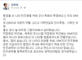 김 부소장은 12일 소셜네트워크서비스(SNS) '페이스북'을 통해 "박정희와 박근혜, 혹독한 유신시절 박정희와 박근혜는 아버지와 딸이 아니라 파트너로서 이 나라를 얼음제국으로 만들었다"며 "이 나라의 미래를 위해, 아버지의 민주화에 대한 지금까지의 열정이 역사에 욕되지 않(게 하)기 위해 이번 선거는 민주세력이 이겨야 한다"고 밝혔다.