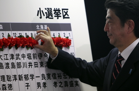 | ▲ 차기 총리에 취임할 아베 신조 자민당 대표가 16일 총선 현황판을 보고 흐뭇한 미소를 짓고 있다. ⓒAP=연합 |