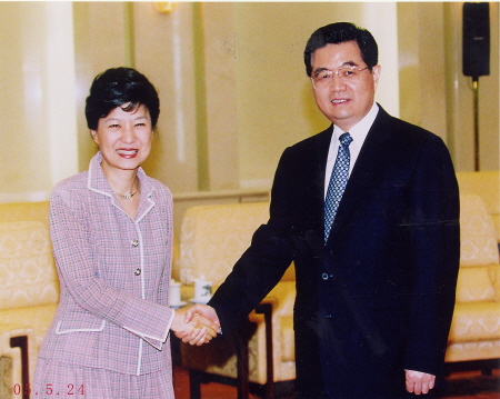 | ▲ 박근혜 당선인에 대해 중국 언론들이 친근감을 표시하면서 중국과의 관계 개선에 대해 관심을 보이고 있다. 사진은 박근혜 당선인이 지난 2005년 후진타오 중국 국가주석을 만나는 모습. ⓒ박근혜 캠프 제공 |