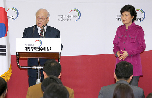 | ▲지난 24일 김용준 인수위원장을 국무총리 후보자에 지명한 박근혜 대통령 당선인이 김 위원장의 발언을 뒤에서 지켜보고 있다. ⓒ박근혜 당선인 홈페이지 |