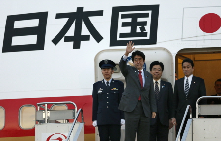 | ▲아베 신조 일본 총리가 취임 후 미국과의 정상회담을 위해 21일 하네다 공항을 통해 출국하고 있다. ⓒAP=연합 |