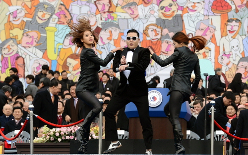 | ▲가수 싸이가 지난 2월 박근혜 대통령 취임식 사전행사에서 공연을 하고 있다. ⓒ뉴시스 |