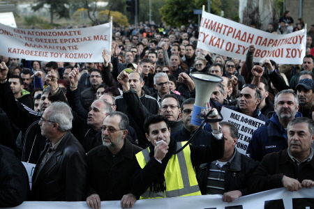 | ▲ 23일 키프로스의 국가부도 위기로 구조조정이 유력한 키프로스 주요은행 직원들이 항의시위를 벌이고 있다. ⓒAP=연합 |