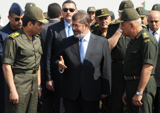 | ▲ 민주적으로 선출된 대통령이라도 군부의 동의 없는 '독재'를 하면, 여론을 빌미로 군부가 대통령을 축줄할 수 있는 것일까? 이집트가 '종교 독재'를 펼친 대통령 지지 세력과 이를 반대하는 세력이 대립하며 내전에 빠져들 우려가 커지고 있다. 사진은 지난해 10월 당시 무르시 대통령과 지난 3일 그를 축출한 군부의 실세 알시시 장군. ⓒAP=연합뉴스 |
