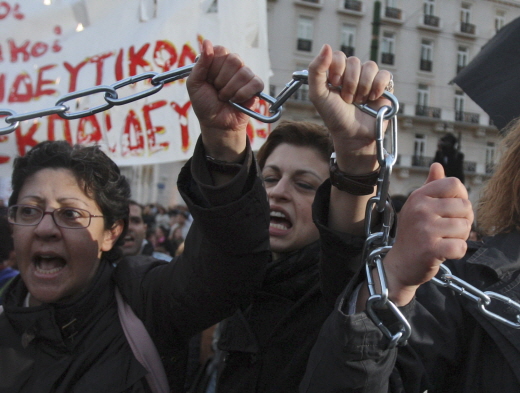 | ▲ 누가 유로존 위기가 사라졌다고 하는가. 유로존 위기는 "바닥에 다가가며 서서히 곪아가는 현재진행형"이라는 경고가 잇따르고 있다. 사진은 그리스의 교사 등 공무원들이 의회 앞에서 반정부 시위를 벌이고 있는 모습. ⓒAP=연합뉴스 |