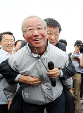 | ▲31일 새만금산업단지를 찾은 현오석 부총리가 투자 기업인을 직접 업어 보이고 있다. ⓒ현 부총리 공식 페이스북(www.facebook.com/mosfmi) |