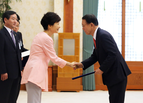 | ▲김기춘 비서실장이 8일 오전 박근혜 대통령으로부터 임명장을 수여받은 뒤 악수하고 있다. ⓒ연합뉴스 |