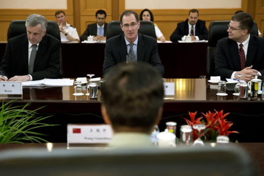| ▲제임스 밀러 미 국방부 차관(가운데)이 9일 베이징에서 중국의 왕관중 인민해방군 부총참모장과 회담하고 있다. ⓒAP=연합 |