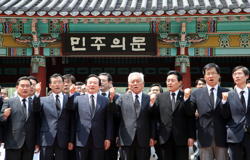 | ▲ 민주당 김한길 대표, 전병헌 원내대표, 민주당 소속 국회의원, 지자체장들이 16일 오후 광주 북구 운정동 국립 5·18 민주묘지 민주의 문 앞에서 '을(乙)'을 위한 민주당 광주선언을 발표한 뒤 '임을 위한 행진곡을 제창하고 있다. ⓒ연합뉴스 |