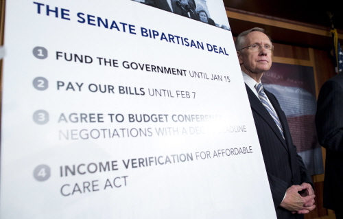 | ▲ 16일(현지시간) 국가부도 하루 전에 미국 정치권의 임시 합의안을 마련해 상. 하 양원을 통과햇다. 사진은 협상 주역 해리 리드 민주당 상원 원내 대표가 '초당적 합의안'을 설명하는 가자회견 앞에 서있는 모습. ⓒAP=연합뉴스 |