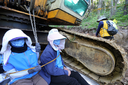 | ▲ 21일 경상남도 밀양시 단장면 바드리 야산 송전탑 공사 현장으로 가는 길목에서 마을 주민들이 공사 장비인 굴착기에 쇠사슬로 몸을 묶고 저지에 나섰다. ⓒ연합뉴스 |