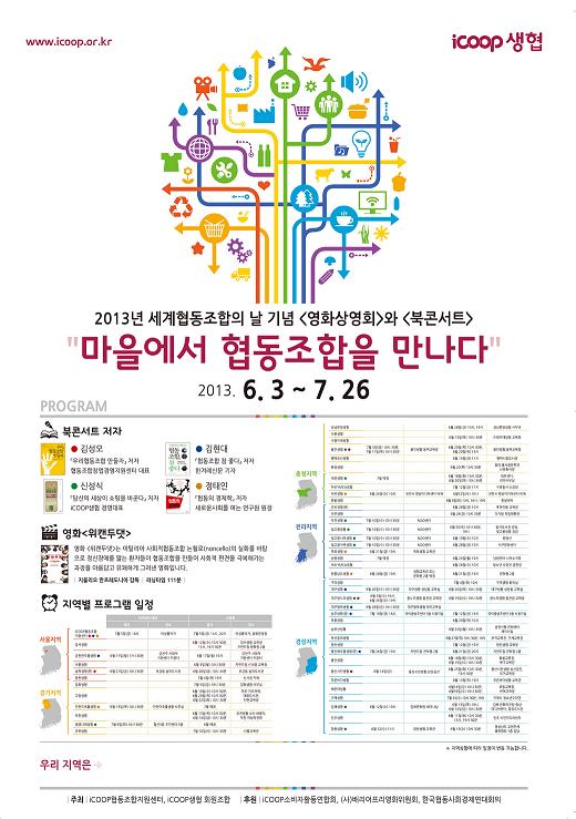 iCOOP생협은 이탈리아 최대 사회적협동조합인 논첼로(noncello)를 모티브로 한 영화 <위캔두댓> 상영을 포함해 △신성신 iCOOP생협 경영대표의 '당신의 쇼핑이 세상을 바꾼다' △김성오 협동조합창업경영지원센터 대표의 '우리 협동조합 만들자' △정태인 새로운 사회를 여는 연구원 원장의 '협동의 경제학' △김현대 한겨레신문 기자의 '협동조합 참 좋다' 등 협동조합 관련 서적 저자와의 강연을 준비했다.