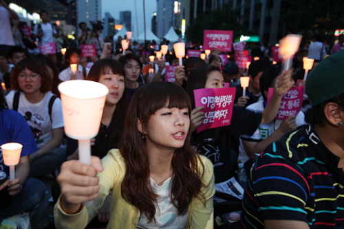 | ▲ 지난 10일 광화문 일대에서 개최된 '반값 등록금' 실현을 촉구하는 촛불 집회에서 참가 학생들이 구호를 외치고 있다. ⓒ프레시안(최형락) |