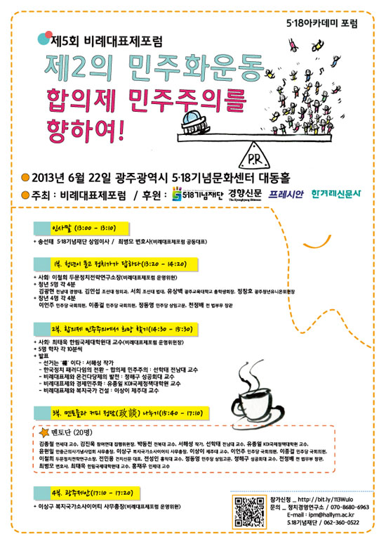 비례대표제포럼과 한림대 정치경영연구소가 주최하고 프레시안과 5.18기념재단, 경향신문, 한겨레신문이 후원하는 제5회 비례대표제 포럼 '제2의 민주화운동: 합의제 민주주의를 향하여!'가 6월 22일 광주 5.18기념문화센터에서 열립니다.