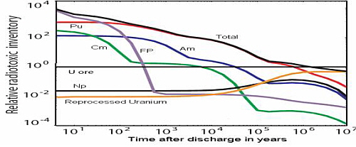 아래 그림은 사용 후 핵연료의 방사능 쇠퇴 기간을 나타내는 것인데, 직접 처분의 경우(Total) 천연우라늄 정도의 방사능으로 낮아지기까지 최소한 10만 년이 소요된다. 그러나 추진파의 주장에 따르면, 재처리 공정에서 장수명 핵종(Pu, Am, Cm 등)을 분리시키면, 이 기간이 약 1000년 이하로 줄어든다. 그 위험도가 줄어드니 당연히 최종 처분장의 확보도 용이하다.