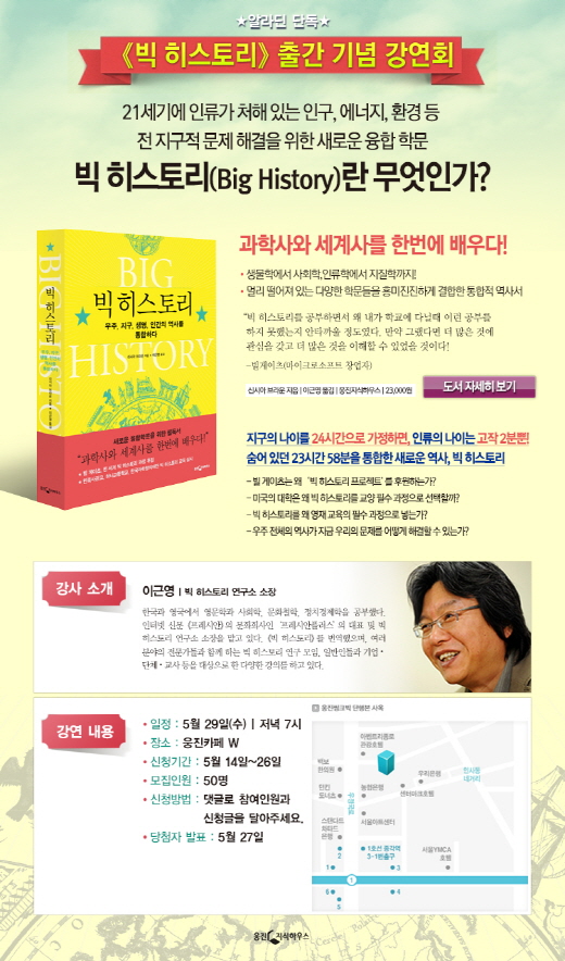 137억 년 전 빅뱅에서부터 21세기 현재까지라는 거대한 시간을 엮어내는 새로운 역사, 빅 히스토리의 '입구'가 되어 줄 이번 강연에 참여하고 싶은 독자는 인터넷 서점 알라딘의 강연 소개 페이지(☞바로 가기)에 댓글을 달아 신청하면 된다. 총 50명을 초대하며, 신청은 26일까지이다. 담청자는 27일에 발표된다.