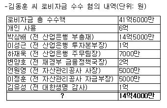 김 씨가 법정에서 진술한, 현대차로부터 받은 총 로비자금은 41억6000여만 원. 이 중 6억 원은 김 씨가 "내가 썼다"고 밝혔고, 나머지 35억6000여만 원은 금융기관과 유관기관에 로비자금으로 사용했다고 진술했다.