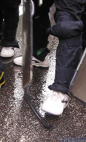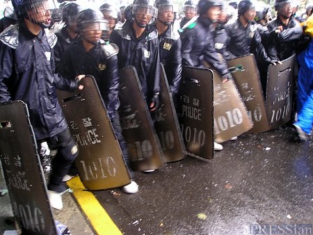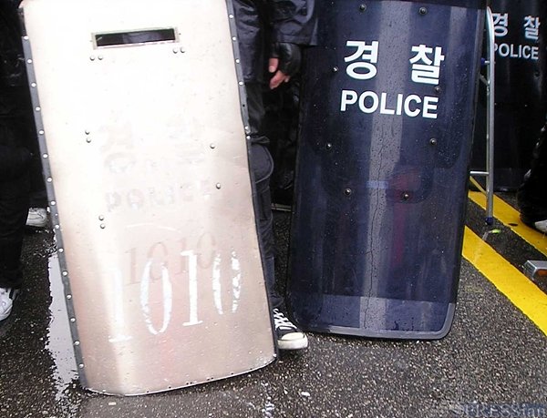 15일 서울 광화문에서 열린 '2006 자주평화 대행진' 직후 벌어진 경찰과 포항건설노조원들 사이의 대치 상황에서 기자가 직접 확인한 결과, 도로 중앙선을 기준으로 8차선 도로의 좌측 4개 차선을 막고 선 경찰 병력 맨 앞 줄 20명 중 10명이 방패 아래의 고무패킹 부분이 손상된 방패를 들고 서 있었다.