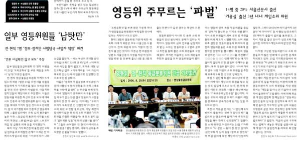 기윤실이 문제 삼은 <한겨레>의 기사는 모두 3건. <한겨레>는 25일 저녁 웹페이지에 "도박산업 규제 외치던 시민단체 '기윤실'", "영등위원들 '남탓만'", "영등위도 싹쓸이 인사?" 등이 제목 아래 3건의 기사를 나란히 내보냈고, 26일자 지면에는 "도박산업…" 기사를 제외한 2개의 기사를 5면에 게재했다. 26일자 지면에는 "영등위도 싹쓸이 인사?" 기사의 제목이 "영등위 주무르는 '파벌'"로 바뀌었다.