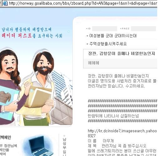김항문은 지난달 17일 여성부 자유게시판에서도 사이버 성폭행을 자행한 뒤 이 사실을 남성가족부 게시판에 알렸고, 이 글에 "존경합니다" "김항문니마 정말 최고" 등 김항문을 두둔하는 댓글이 달렸다.