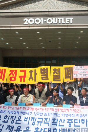 이랜드-까르푸-뉴코아 3사 노동조합 공동투쟁본부는 25일 이 점포 앞에서 기자회견을 열어 "2001아울렛 부평점은 1000여 명의 노동자 중 33명 만이 정규직"이라며 "'백화점을 할인하는 곳'이 아니라 '노동자를 할인하는 곳'"이라고 비판했다.