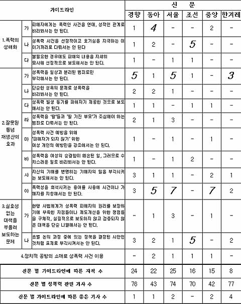 민우회는 7개월 동안 6개 일간지에 게재된 386건의 성폭력 관련 보도 가운데 110건의 보도가 성폭력 사건을 희화화하거나 선정적으로 보도하는 등 다양한 오류를 보였다고 밝혔다. 반면 '좋은 기사'로 분석된 것은 10건에 그쳤다.