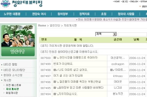 아이디 'sandra'는 "국민으로서 할 말을 하는 것인데 글을 삭제하는 것은 도대체 무슨 황당한 경우"라며 "이런 글 다 프린트해서 회의 해도 모자랄 판에 왜 지우고 난리냐"고 항의했다. 아이디 '분노직전'도 "당신들이 대통령의 눈과 귀를 막아서 어쩌겠다는 겁니까"라고 거칠게 항의했다.