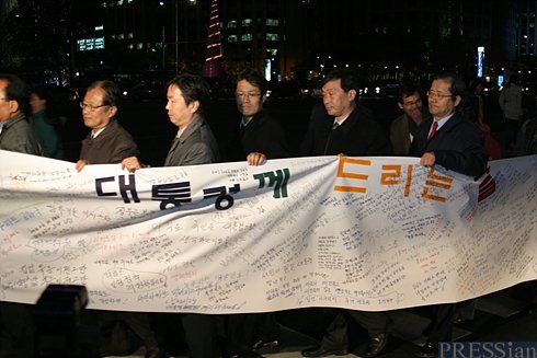 신민철 아내모 대표는 "개혁 열망으로 노무현 대통령을 당선시키고, 역시 개혁 열망으로 탄핵에서 노 대통령을 극적으로 구출했다"며 "그러나 노 대통령의 '분양원가 공개' 대선공약은 말뿐이었다. '시장원리에 안 맞는다'며 약속을 뒤집었다"고 비판했다.