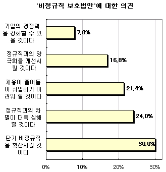 온랑니 취업사이트 '사람인'(www.saramin.co.kr)이 리서치 전문 기관 폴에버(www.pollever.com)와 함께 직장인과 구직자 3811명을 대상으로 "비정규직 보호법안에 대해 어떻게 생각하십니까?"라는 설문을 진행한 결과, '단기 비정규직을 확산시킬 것이다'라는 응답이 30%로 가장 많았고, '정규직과의 차별이 더욱 심해질 것이다'가 24%, '채용이 줄어들어 취업이 더 어려워질 것이다'라는 응답이 21.4%로 전체의 75.4%가 부정적인 견해를 가지고 있는 것으로 나타났다.