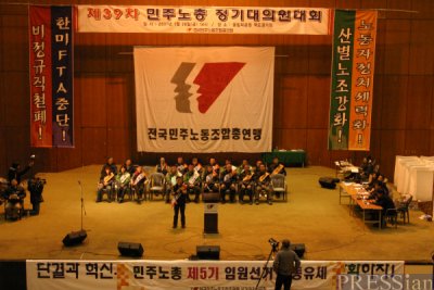 민주노총의 임원 직선제는 아직 무리인 것일까? 제5기 집행부 선거에 출마한 후보진들이 모두 직선제 도입에 원칙적으로 합의하면서 통과 여부에 이목이 집중됐던 규약 수정안이 정족수 미달로 대의원대회가 유회되면서 무산됐다. 이는 집행부 선거가 결선투표까지 가면서 다음날 새벽 2시까지 진행된 탓이다. 임원 직선제의 도입은 지난해 9월 임시대의원대회에서 같은 상황으로 이미 한 차례 무산된 바 있다. 이날 대의원대회에 제출된 직선제 안건은 3가지였다. △위원장-수석부위원장-사무총장 및 대의원 직선제 도입 △회계감사를 제외한 전 임원 직선제 선출 △대의원 직선제 및 비정규할당제 도입. 세 가지의 직선제 안건 가운데 뒤의 두 가지 안건은 조합원들의 반대로 상정 자체가 무산됐다. 부위원장을 제외한 임원과 대의원을 직선으로 선출할 것을 골자로 하는 규약 수정안이 대의원 467명의 찬성으로 상정됐지만, 임원선출 전에 처리할 것인지 선거 다음 안건으로 미룰 것인지를 놓고 다시 한 번 논란이 벌어졌다. 안건 순서에 대한 표결에서 민주노총 대의원들은 임원선거를 먼저 진행할 것을 선택했다. 이는 한편으로는 직선제 도입에 대한 지난한 토론으로 인해 선거 자체가 무산될 것을 우려한 것이면서 또 한편으로는 임원 및 대의원 직선제 도입에 대한 민주노총의 조심스러움을 반영한 것으로 풀이된다. |