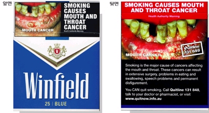 이에 비해 우리나라는 "건강을 해치는 담배 그래도 피우시겠습니까?"라는 경고문만 답뱃갑 앞면의 30%를 차지하고 있고, 뒷면에는 "19세 미만 청소년에게 판매할 수 없습니다. 청소년에게 담배를 판매하는 것은 불법입니다"라는 경고문만 표시돼 있다.