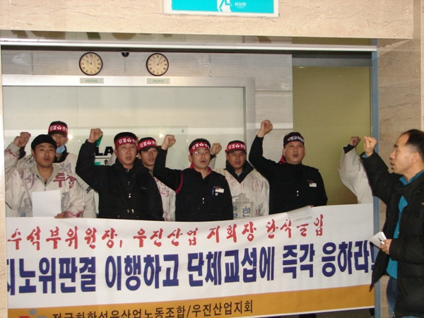 라파즈한라시멘트의 사내하청 업체인 우진산업은 지난 3월 사내에 노조가 만들어지자 25일만에 폐업 신고를 하고 노동자들에게는 계약해지 통고를 했다. 이 과정에서 사측은 교섭은 커녕 노조의 면담 요청에도 응하지 않았다. 원청업체인 라파즈 한라시멘트는 노조 설립 이틀만에 우진산업을 상대로 계약기간 중에 업무조정을 시도함으로써 사실상 노조 활동을 못하도록 했다.