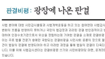 이런 측면에서 의미있는 시도가 2005년부터 실시돼 온 참여연대의 '판결비평'이다. 한상희 참여연대 사법감시센터 소장(건국대 법학과 교수)은 '판결비평'에 대해 "판결문은 국민 모두가 공유하는 것이고 국민들의 승인을 받아야 되는 것"이라며 "법적으로는 끝이 났을지 몰라도 민주적인 측면에서는 국민들에게 수용되어야 하는 것"이라고 말했다.(☞관련기사 보기)